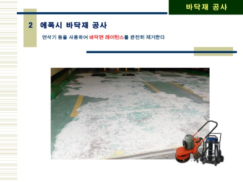 바 닥 재 공 사 2 에폭시 바 닥 재 공 사 연삭기 등을 사용하여 바닥면 레이턴스를 완전히 제거한다
