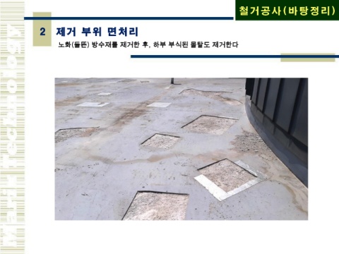 철 거 공 사 (바 탕 정 리 ) 2 제 거 부 위 면 처 리 노화(들뜬) 방수재를 제거한 후, 하부 부식된 몰탈도 제거한다