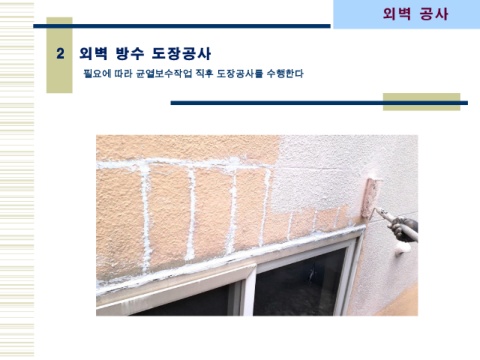 외 벽 공사 2 외 벽 방 수 도장공사 필요에 따라 균열보수작업 직후 도장공사를 수행한다