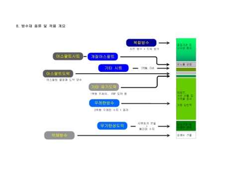 8. 방수재 종류 및 적용 개요 복합방수 , 공공기관 등 시트 방수 + 도막 방수 내구성 중시 아스팔트시트 개질아스팔트 비노출 공법 기타 시트 EPDM, EVA 아스팔트도막 아스팔트 열융해 도막 방수 기타 유기도막 1액형 우레아, FRP 도막 등 아파트, 개인 건물 등 가격을 중시 우레탄방수 우레 탄방수 가장 일반적 2액형 우레탄 수지 + 필러 시멘트계 분말 공공기관 등 무기탄성도막 + 폴리머 수지 우레탄 대체 액체방수 오래된 건물