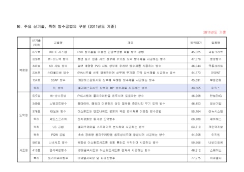 16. 주요 신기술, 특허 방수공법의 구분 (2011년도 기준)
