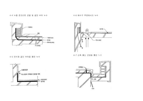 4-4 누름 콘크리트 균열 및 끝단 부위 누수 4-6 배수구 주변에서의 누수 4-7 신축 줄눈 균열을 통한 누수 4-5 방수재 끝단 부위를 통한 누수