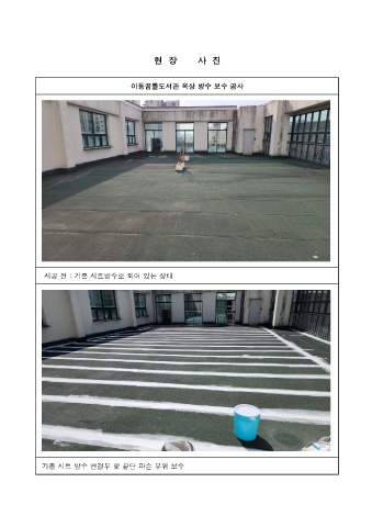 현 장 사 진 이동꿈틀도서관 옥상 방수 보수 공사 시공 전 : 기존 시트방수로 되어 있는 상태 기존 시트 방수 연결부 및 끝단 파손 부위 보수